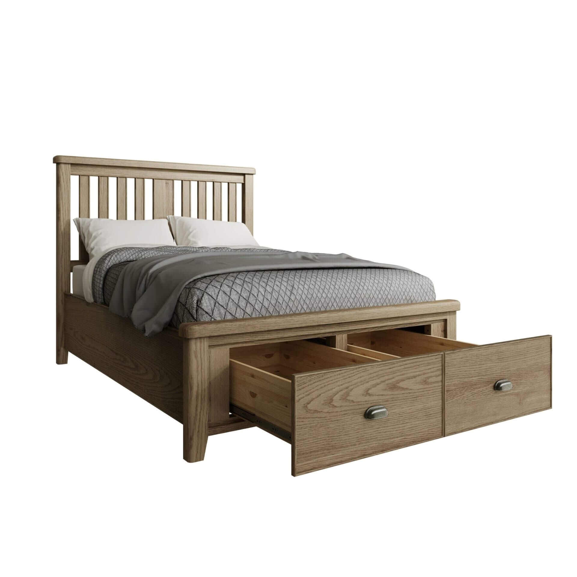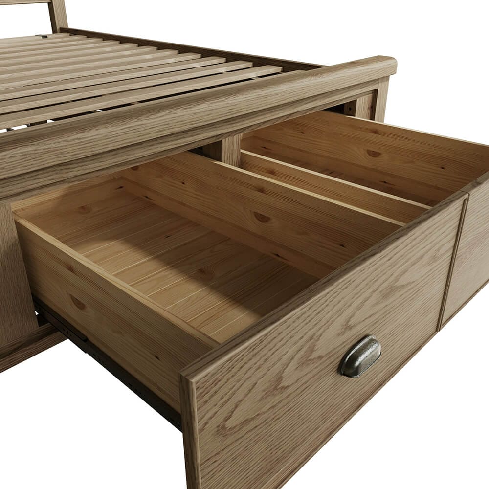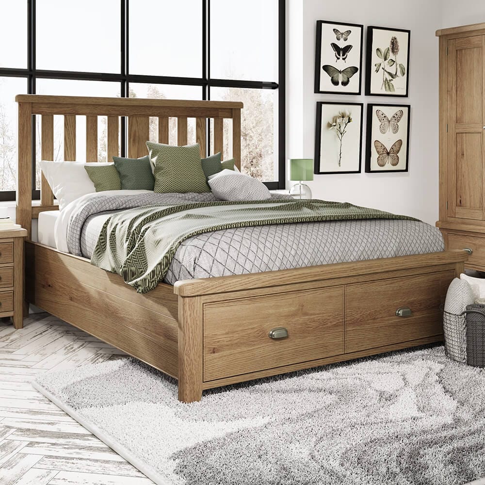 The clever design of the Holburn Oak 4’6″ bed, with 2 end drawers and wooden slatted headboard, will certainly add useful, easily accessible storage solutions to your bedroom.