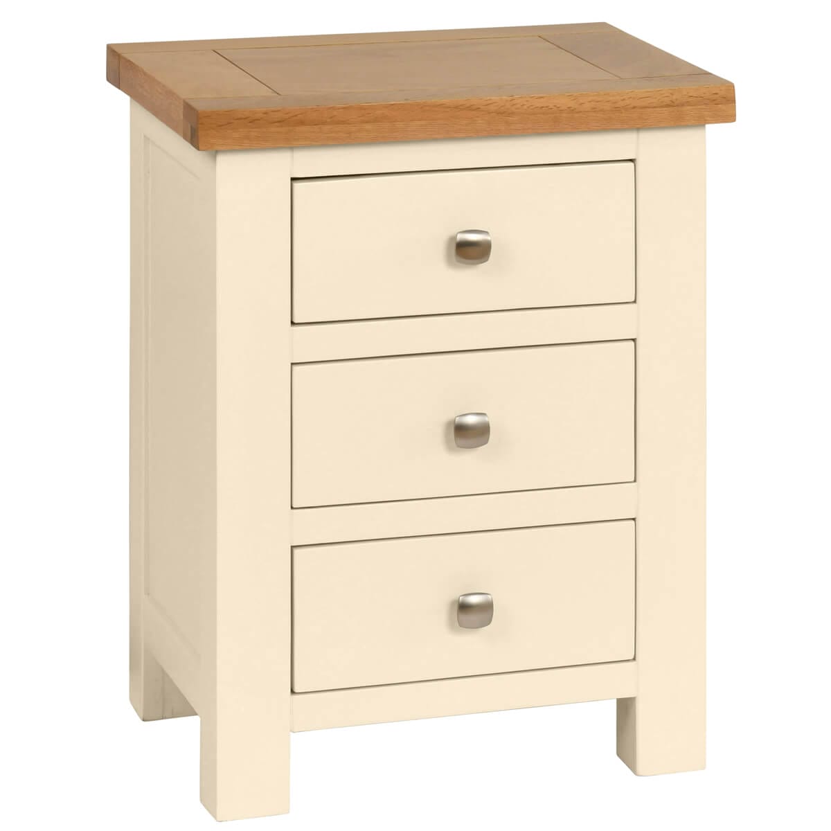 This Dorchester painted 3 drawer bedside is finished in the ever popular ivory colour, with a light oak lacquered top, perfect to complement any bedroom setting.