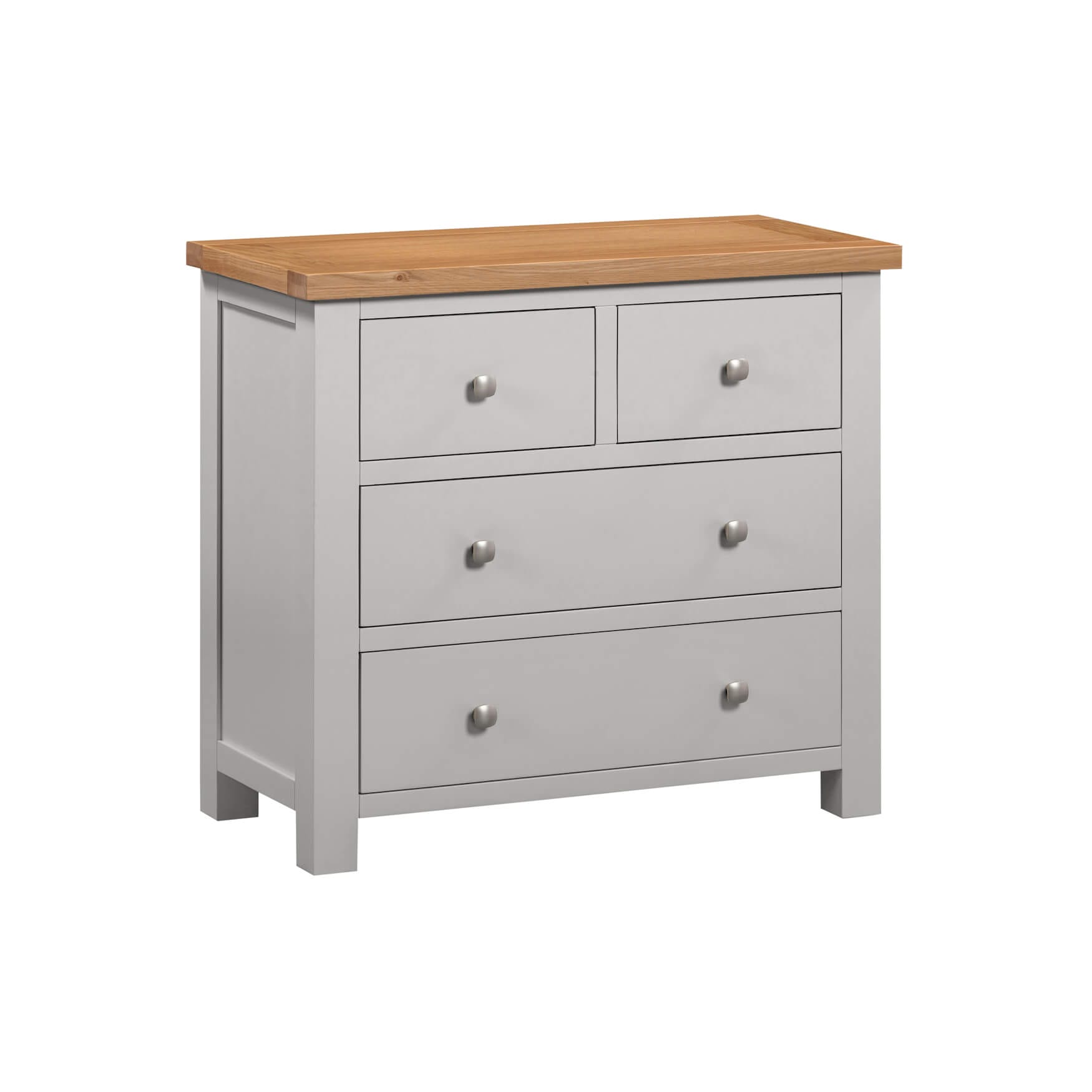 This Dorchester Grey 2 over 2 chest of drawers is perfectly suited to most bedrooms, giving plenty of storage with a clean and stylish look. Dorchester Grey is a modern range with clean straight lines, stylish panels and dovetail drawers, with a modern square metal knob and the top finished in a protective, light lacquer.