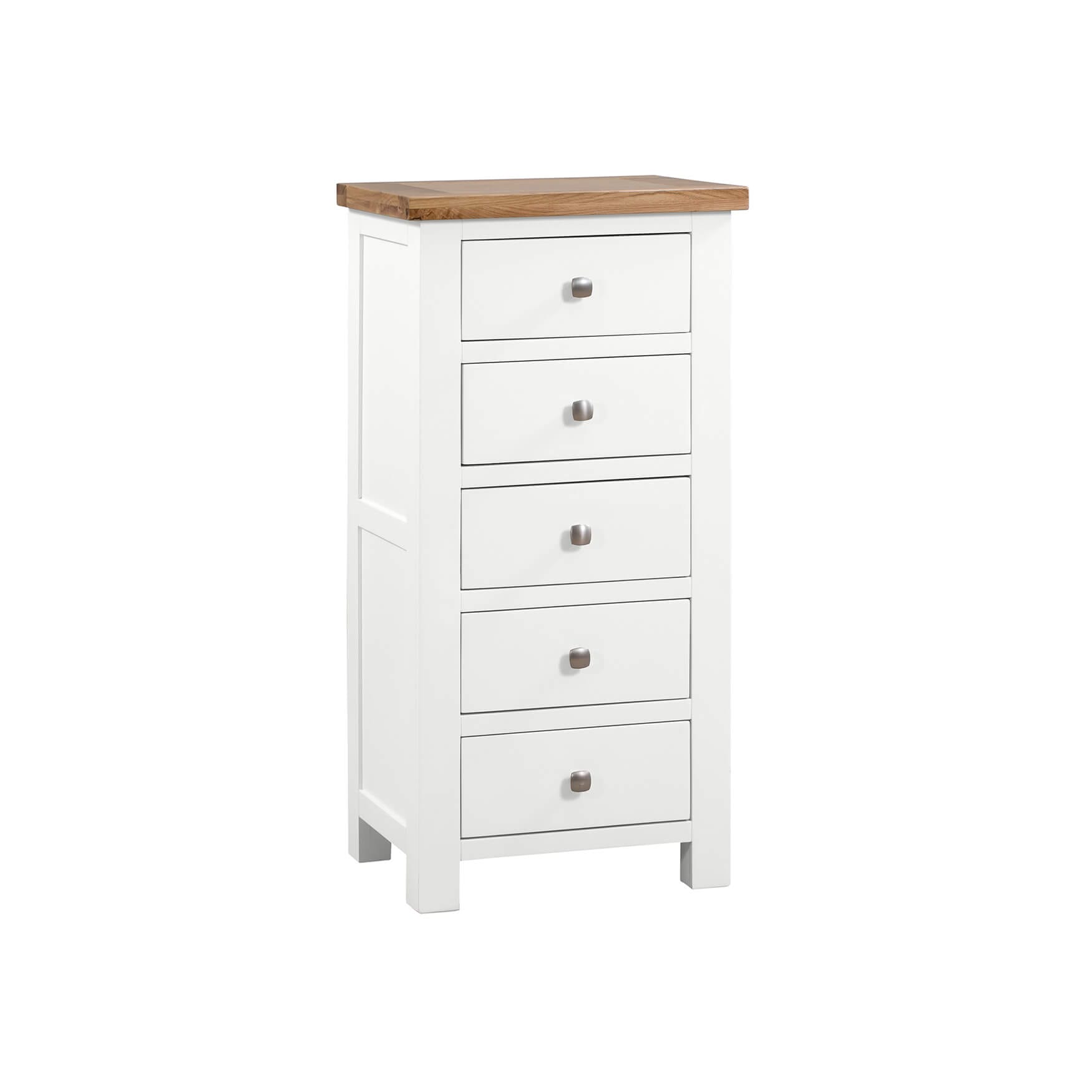 The Dorchester painted 5 drawer wellington / tall-boy chest, finished in the ever popular white colour, with a light oak lacquered top adds extra storage to smaller rooms.