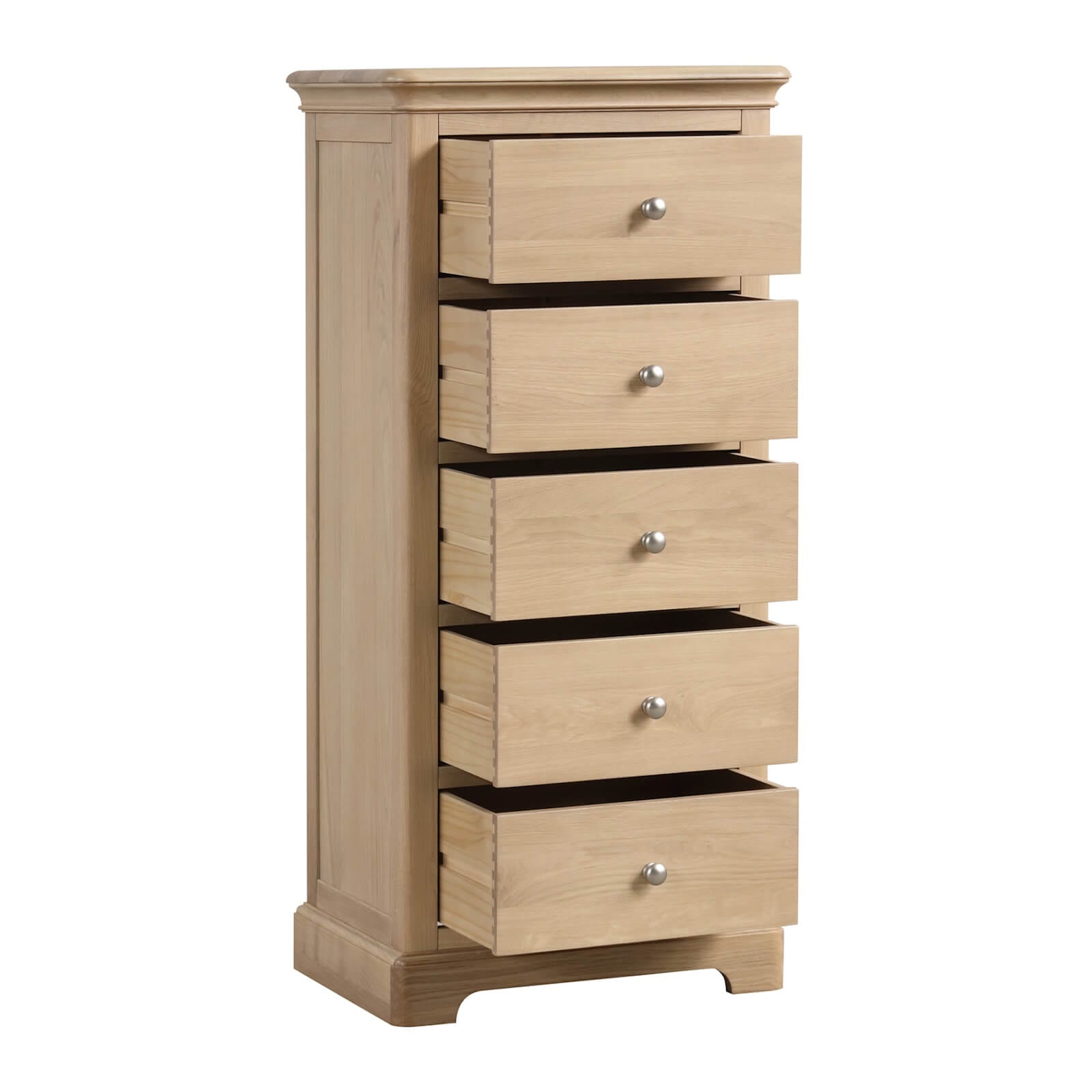 A beautifully crafted 5 drawer Wellington chest radiates a sophisticated ambience with gently curved edges, rounded tops, sculptured plinths and a beautiful pale oak finish, makes this Winchester Oak piece is a true showstopper.