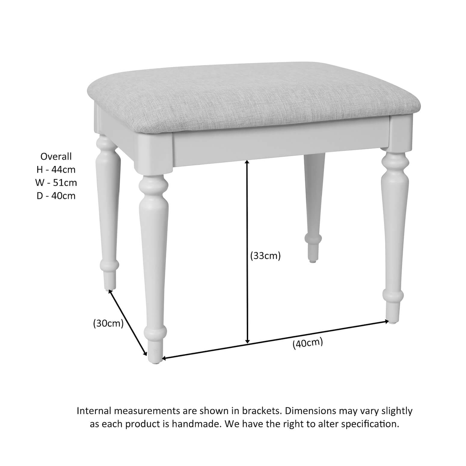 A beautifully crafted dressing table stool painted in our new Grey Mist colour. The seat pad is a grey fabric.