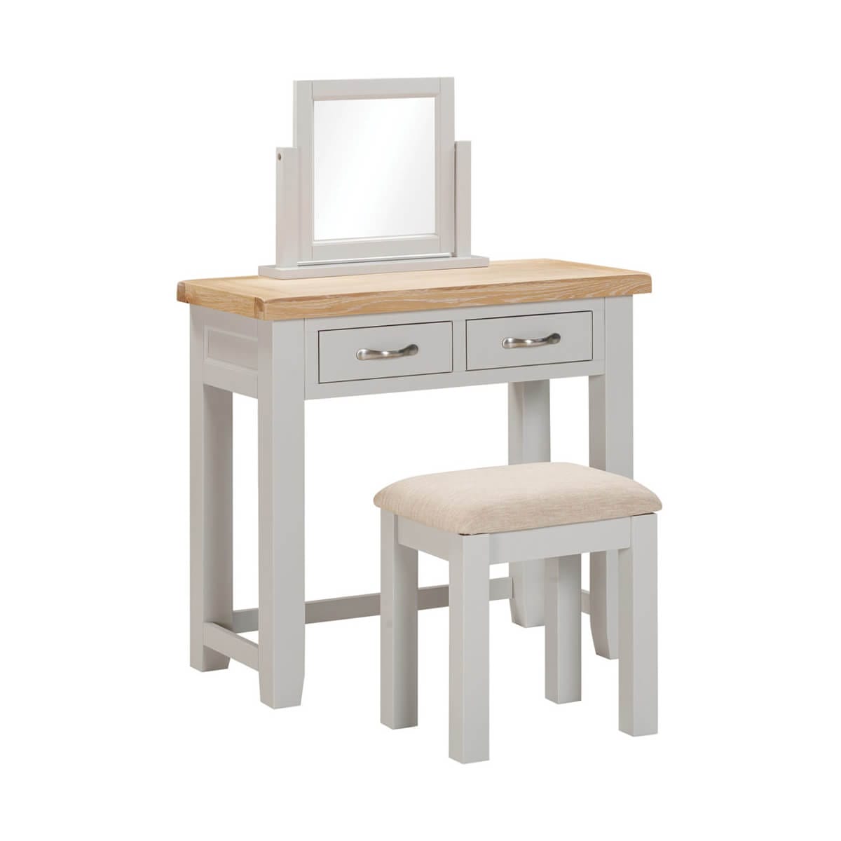 Our elegant and contemporary dressing table provides the ideal spot to get ready in the morning. With a spacious surface area for a mirror and workspace, as well as two useful drawers to store all of your beauty products and hair accessories. Add our stool and mirror to complete the set. This table also works well as a desk with it’s generously sized surface area for your laptop and ample workspace.
