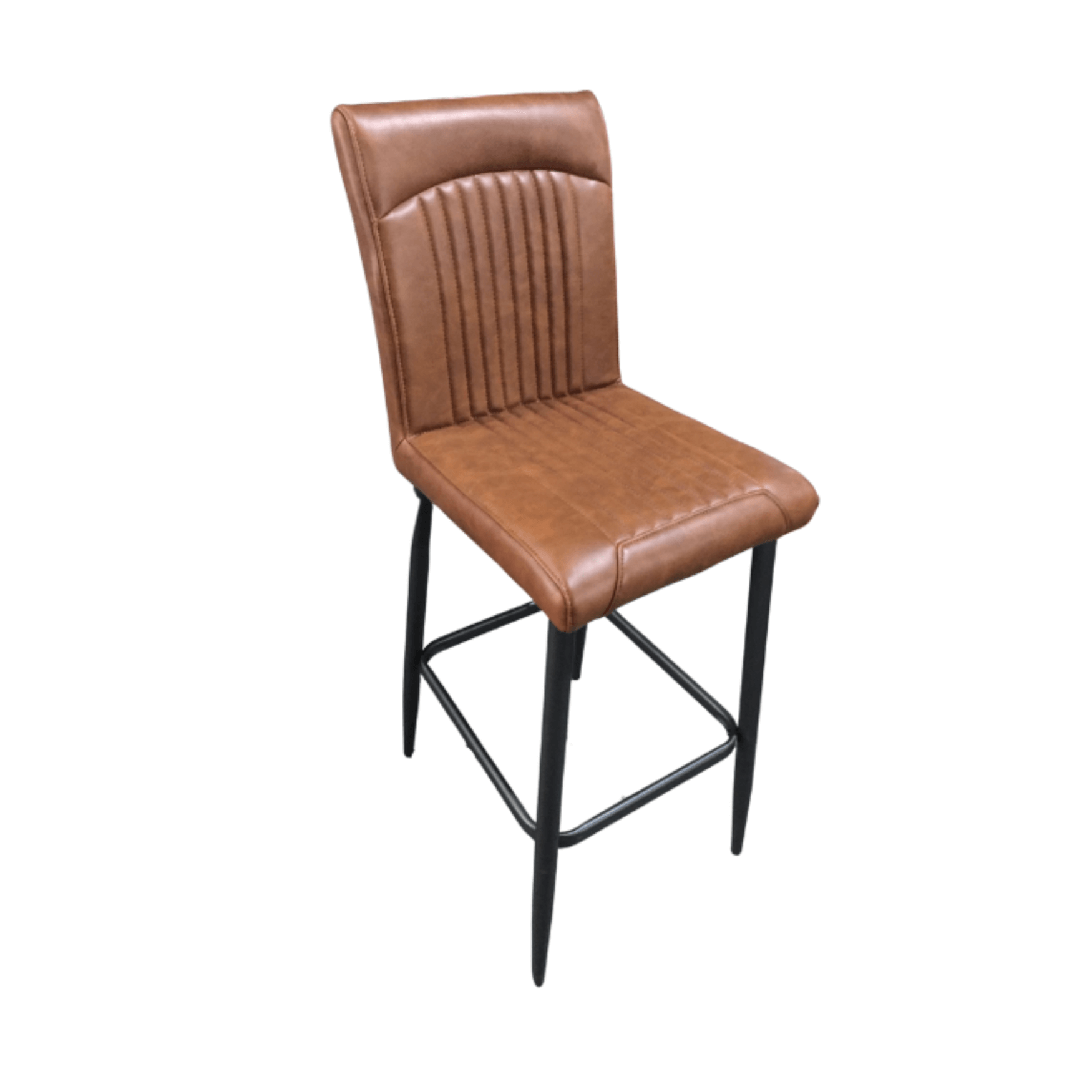 A beautiful bar stool on metal legs with a stylish vegan leather seat in tan colour.