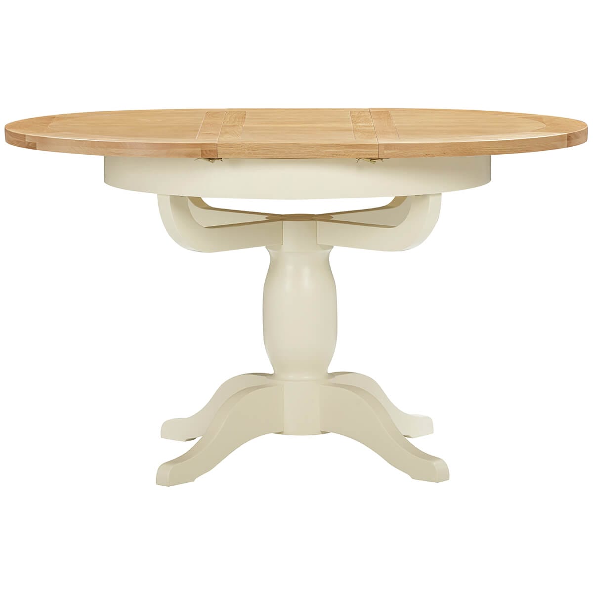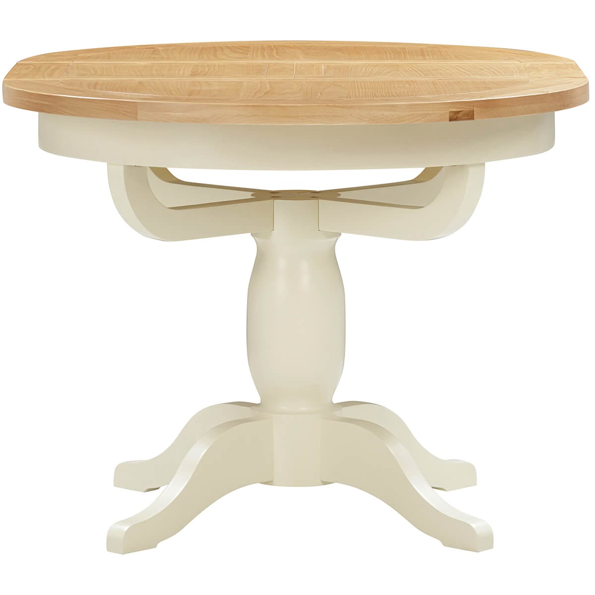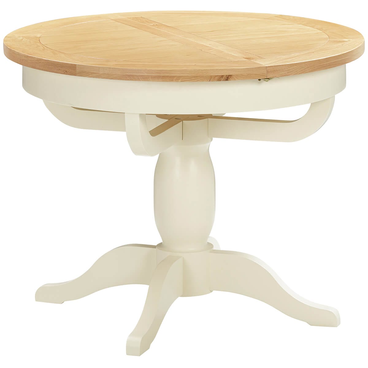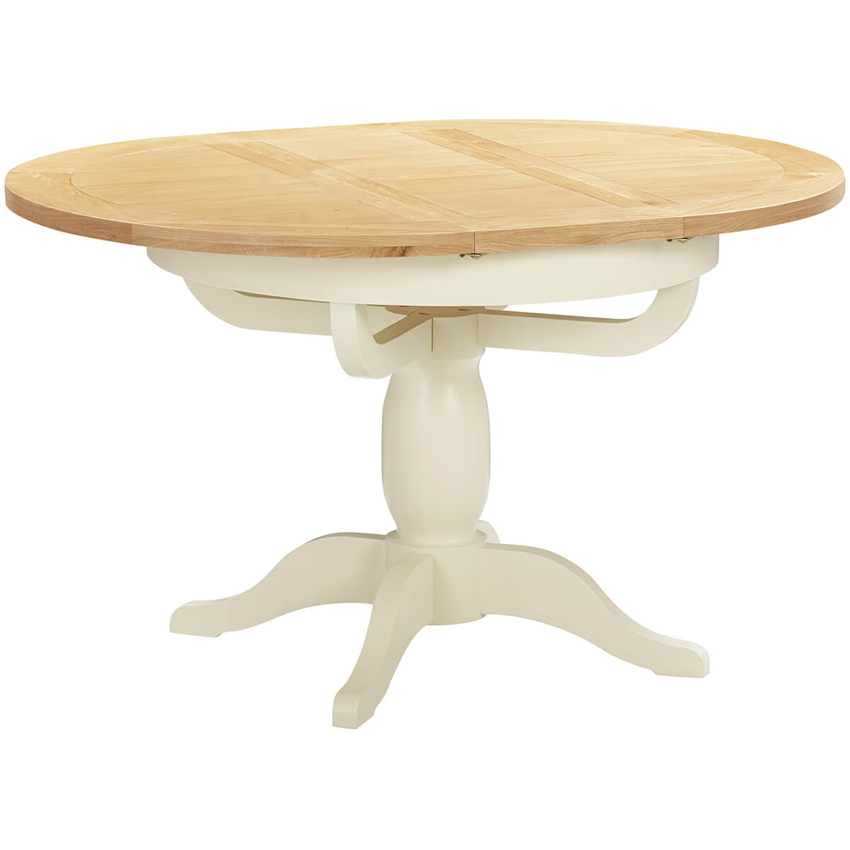 This elegant round to oval extending dining table features a stunning ivory painted pedestal on four feet, creating a stunning contrast against the natural oak top. It also extends from 100cm to 135cm. With a handy butterfly extension leaf which stores inside the table, making this table super easy to extend. Comfortably seats 4-6 people. Supplied as standard in Ivory but also available in white or grey.