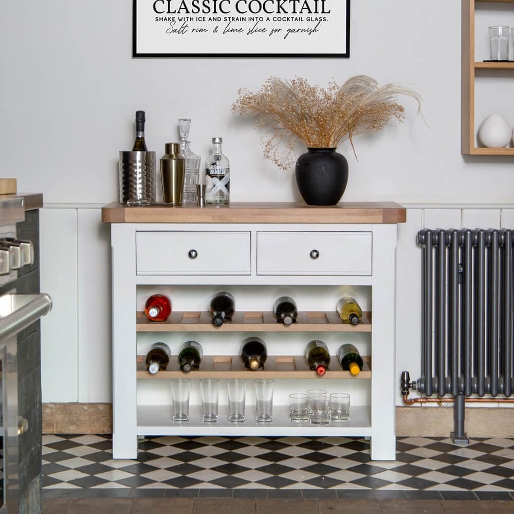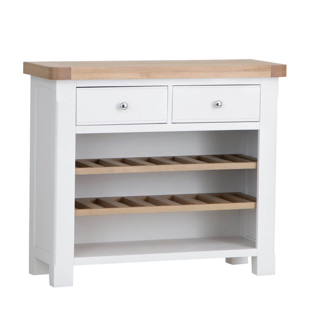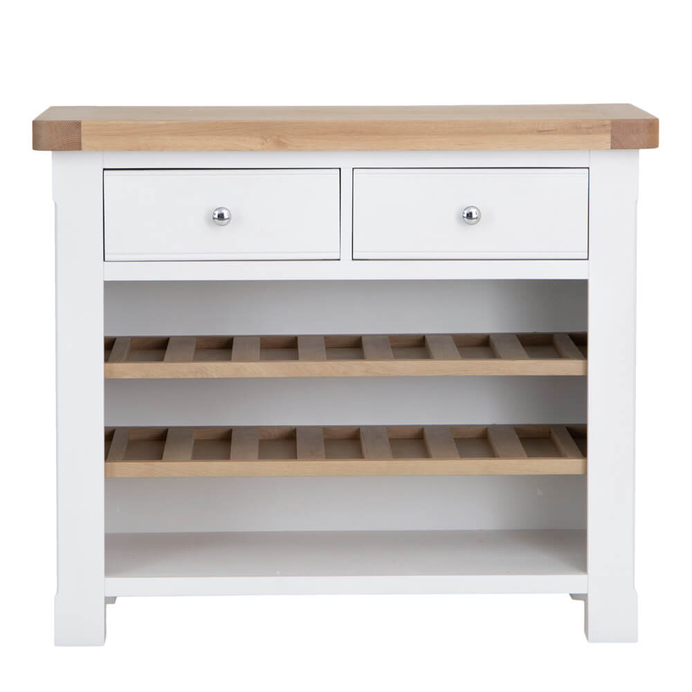 The Malvern Painted wine rack consists of 2 shelves for laying your wine collection, an open shelf for glasses and 2 useful storage drawers.
