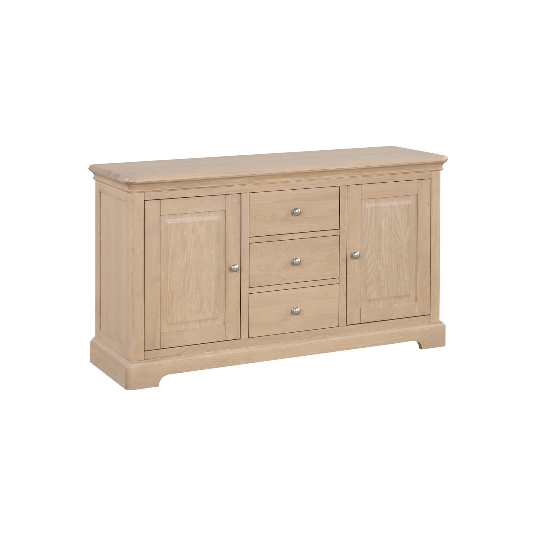 A beautifully crafted 2 door, 3 drawer sideboard radiates a sophisticated ambience with gently curved edges, rounded tops, sculptured plinths and a beautiful pale oak finish, makes this Winchester Oak piece a true showstopper.