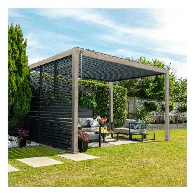 This pergola is the perfect opportunity to extend your outdoor season. Thanks to the tilting double-layer louvres, you can switch between a closed, sheltered space, and an open top to allow sunlight to come flooding in. This means that you can use your outdoor area even when the weather is less than perfect. This pergola ultimately allows you to choose between sitting in sunshine or shade, and provides shelter should it start to rain at a moment’s notice – typical of British weather!