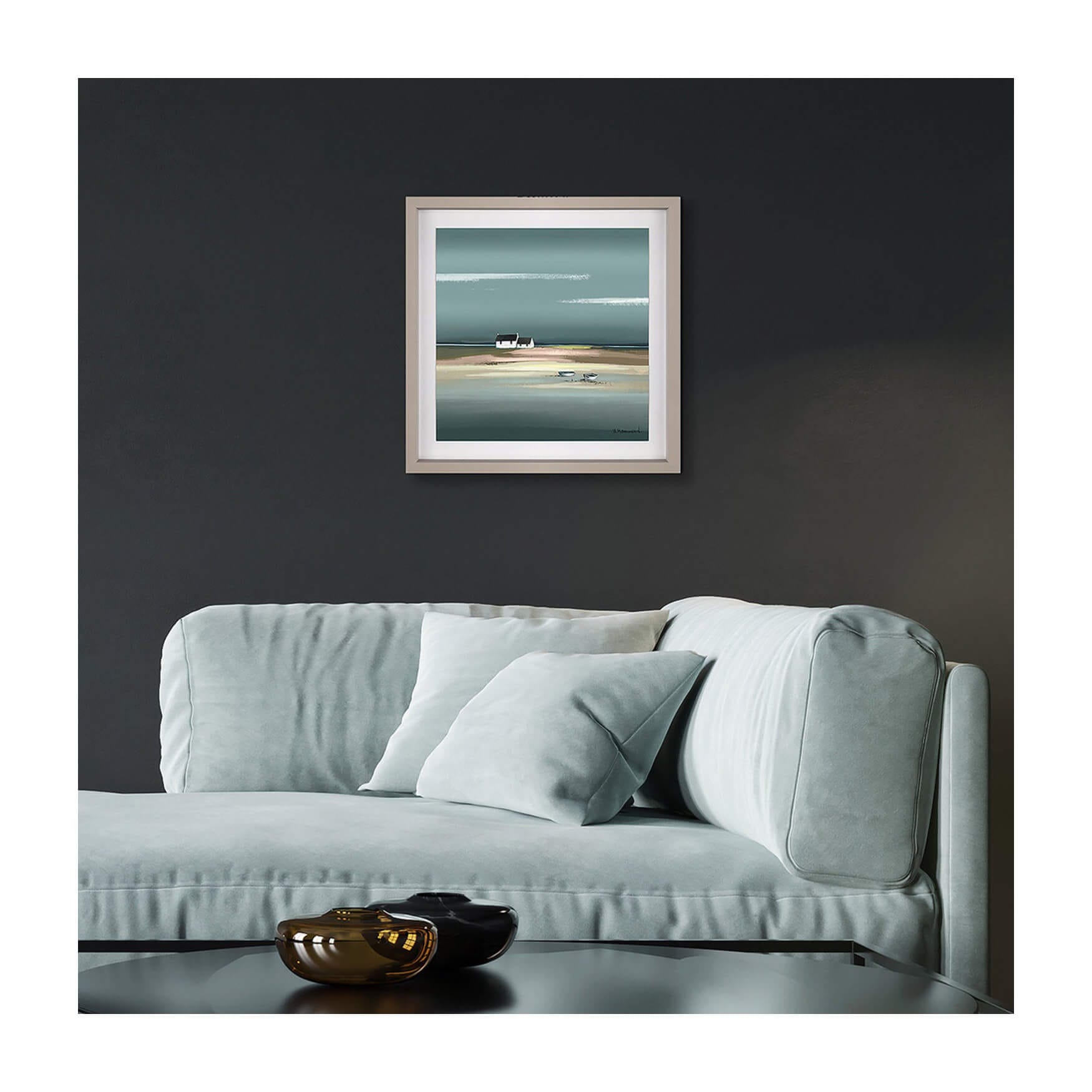 Two boats beached at low tide mimic the two high and dry cottages ashore in Ulyana Hammond’s serene seascape with a cool, calm palette of greys, greens, earthy browns and salmon pinks.