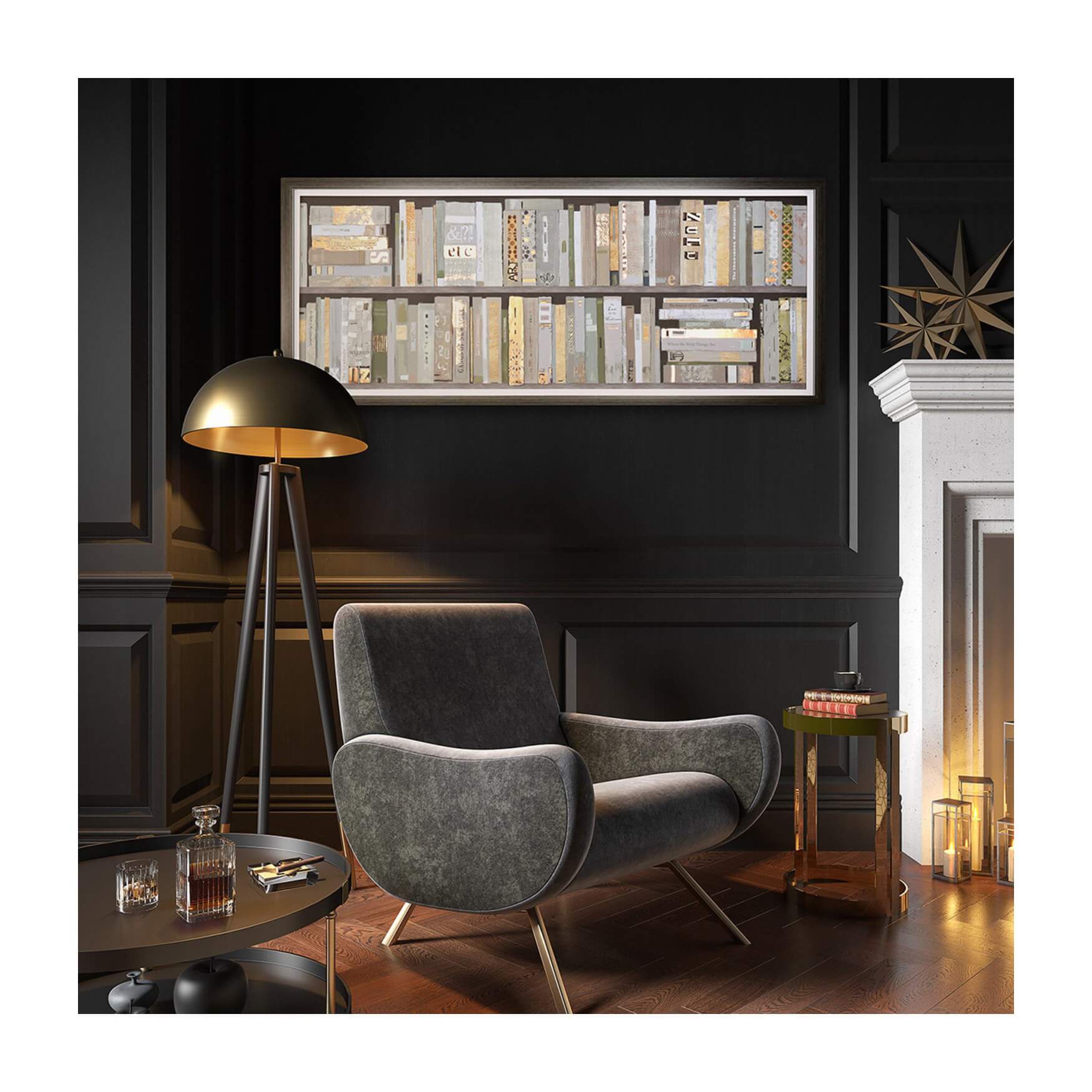 Colours – dark muted metallic frame with a hushed, neutral palette and soft gold highlights.