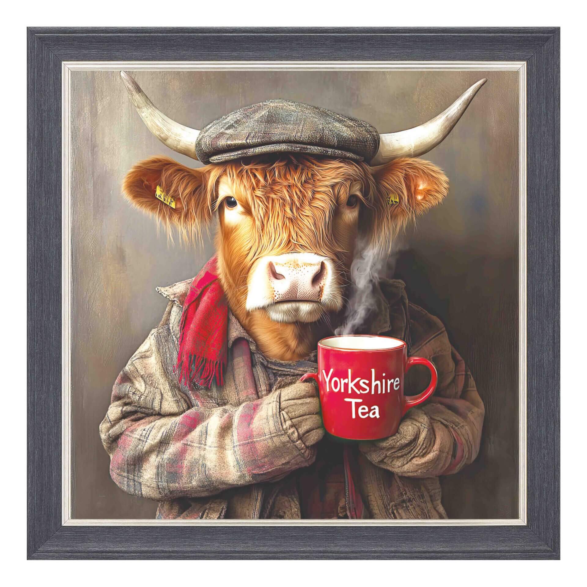 A beautiful and amusing glazed and framed picture of a Highland Cow drinking tea!