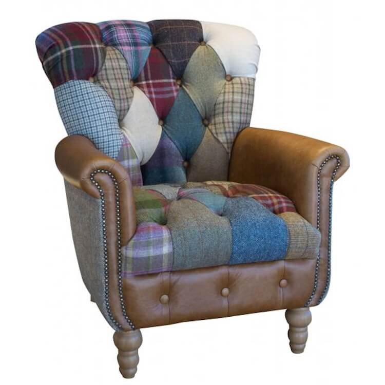 A really unique armchair – the Gotham Harlequin patchwork style is a completely random mix of Harris Tweeds and wools (including Moon wool), ensuring that no two pieces will be the same.