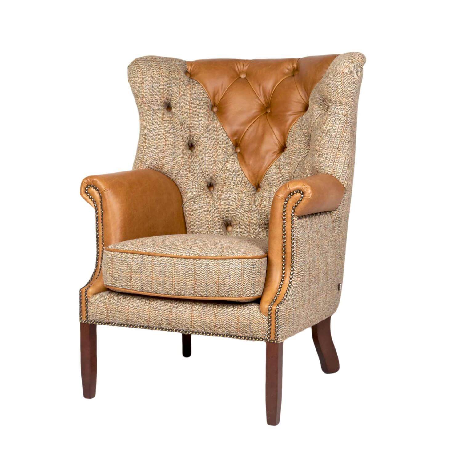 A sumptuous chair, originating from the original wing design this model has sloping wings, scrolled arms, studs and piped detailing all of which define the original Wing chair. A very popular modern classic, finished in Harris Tweed Gamekeeper Thorn and Cerato Brown leather.