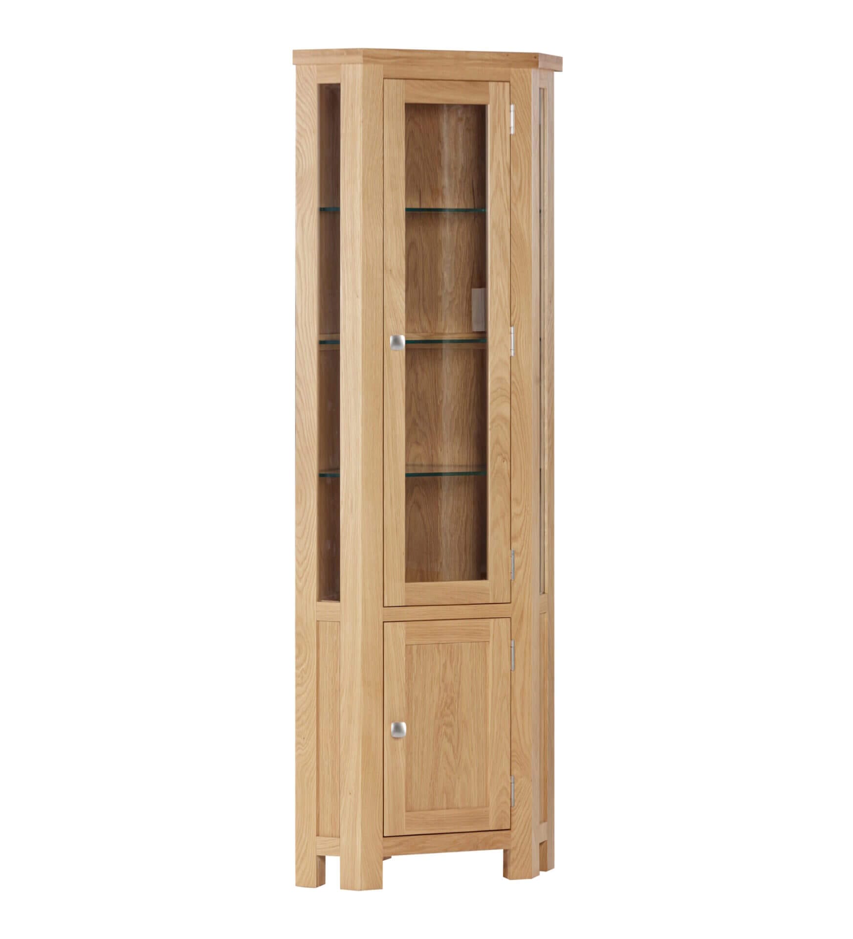 The Dorchester Oak corner glazed display cabinet features glass doors, side panels along with 3 glass shelves and a light enabling you to display your collectibles. A lower cupboard is also fitted allowing more storage opportunities.