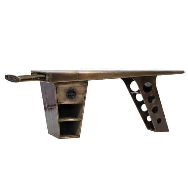 The Aviator half wing desk, finished in vintage jet brass, is hand crafted aluminium aviation style metal work – this creates a striking piece of furniture for your home or office.