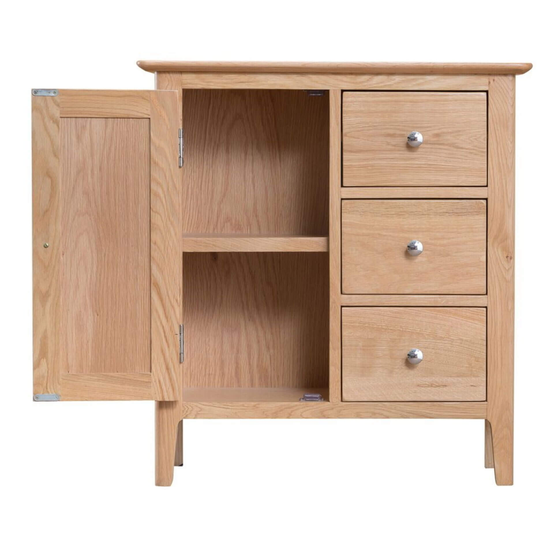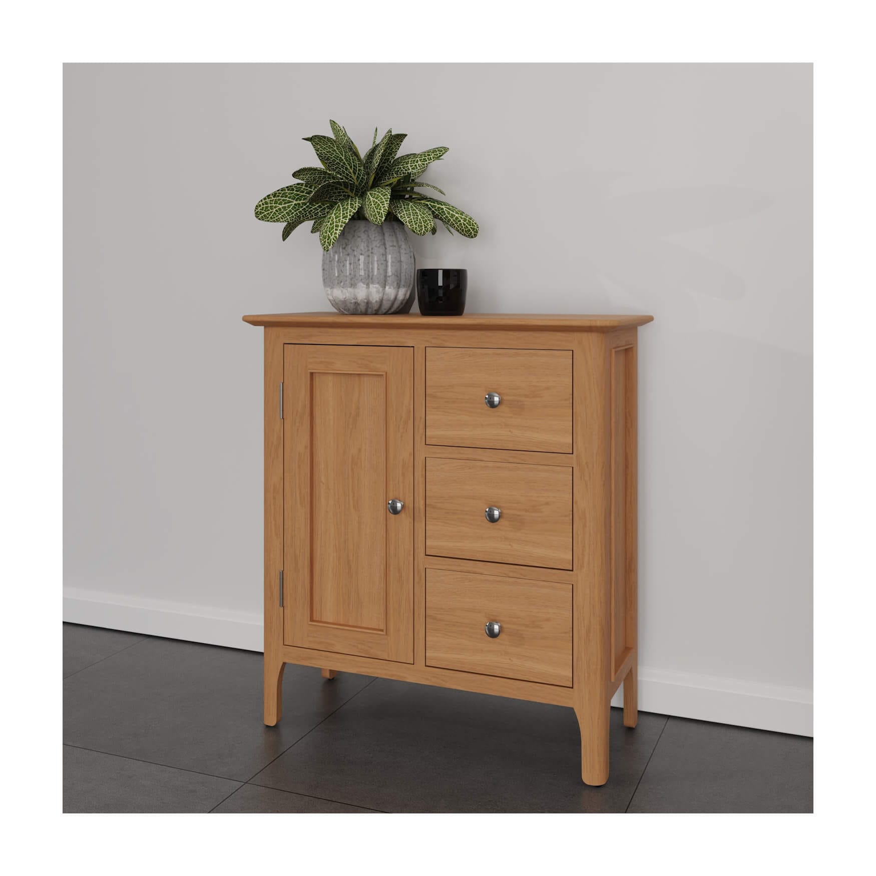 This cupboard offers a variety of storage solutions, featuring a door on the left (with removable shelf) and 3 drawers on the right.