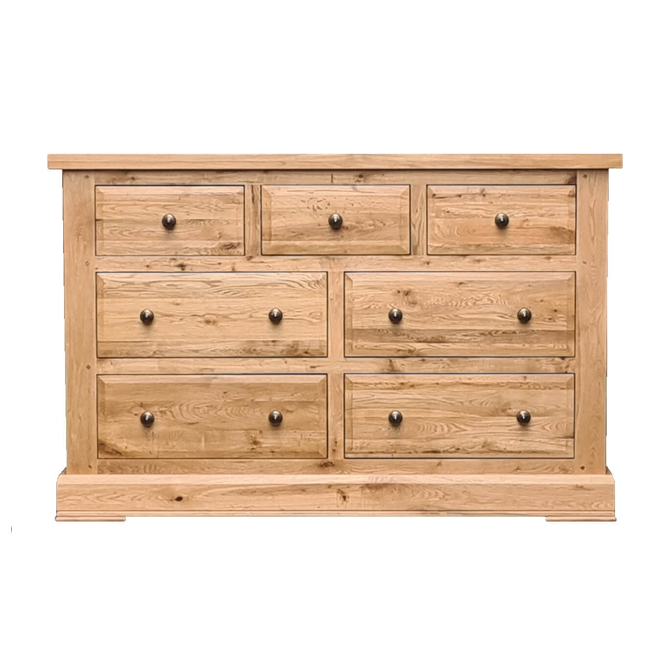 The 7 drawer solid oak Cathedral chest is both stylish and useful in any room setting where storage is required. Designed and crafted to showcase the beautiful characteristics of oak it features dovetailed drawers, solid panelling and diamond dowel detail to give a stylish yet traditional look. Finished in a natural matt lacquer finish it will enhance your bedroom settings.