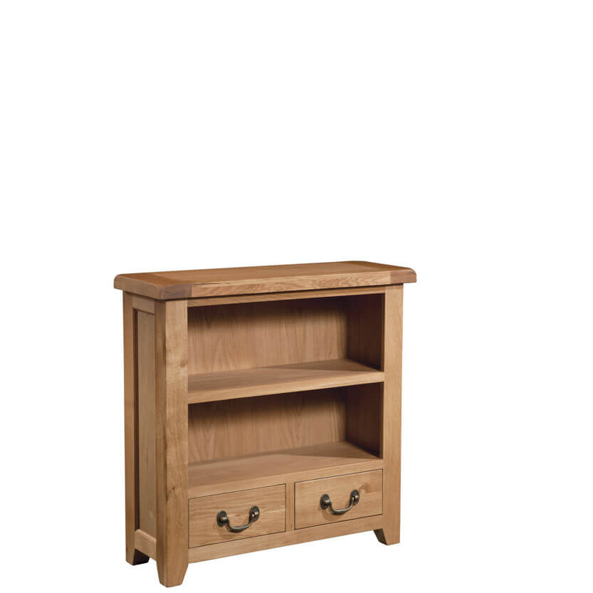 This 2 drawer wide bookcase is from the chunky and sophisticated Somerset Oak range – it has softened corners and is made using traditional techniques including dovetailed drawers, featuring classic brass-effect metal drop handles and finished in a modern, warm-toned wax.
